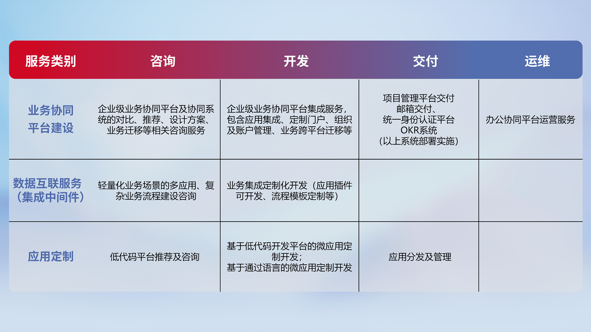 针对钉钉、、、、企微、、IDaas等平台级产品提供产品的规划、、、、方案、、交付、、、、定制化开发等服务,,,,实现如统一协同办公、、、、智能客户服务、、、混合会议管理、、智能数据查询、、、、等业务场景,,,,实现数字化转型。。。