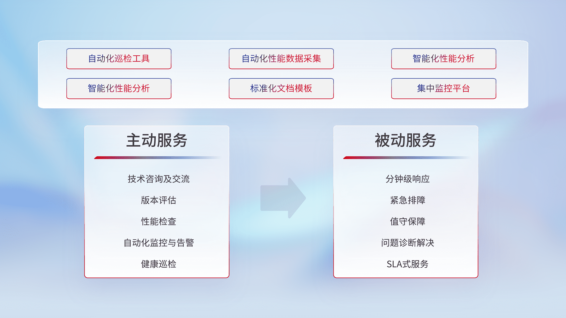 智能化工具和标准化文档,,,保障服务质量,,,提供主动服务(包含技术咨询、、、、版本评估、、、性能检查、、、自动化监控与告警、、、、健康巡检)和被动服务包含(分钟级响应、、、紧急排障、、、、值守保障、、、问题诊断解决、、SLA服务)。。。。