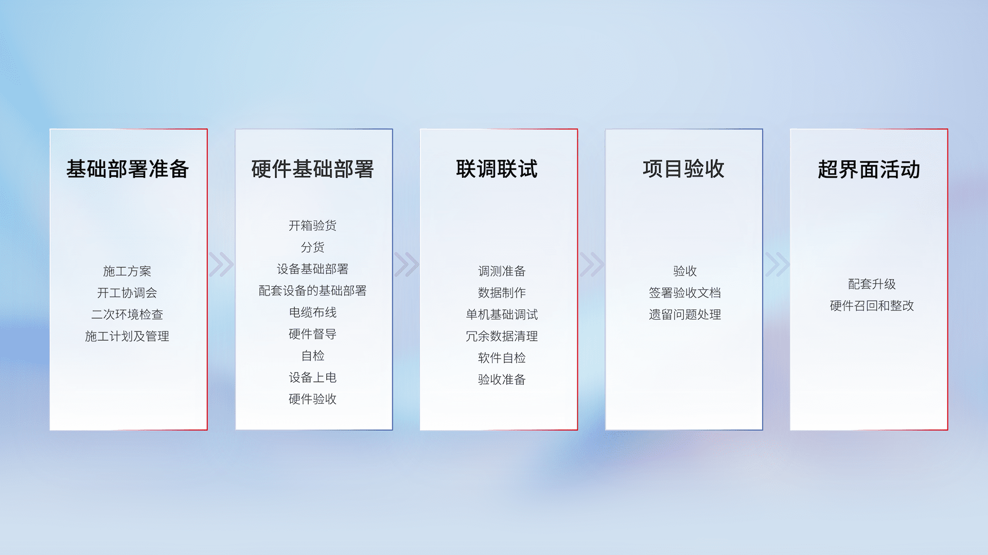 从基础部署准备、、硬件基础部署、、、联调联试、、、项目验收、、、越界面活动的全过程可追溯,,,保证施工质量和进度。。。
